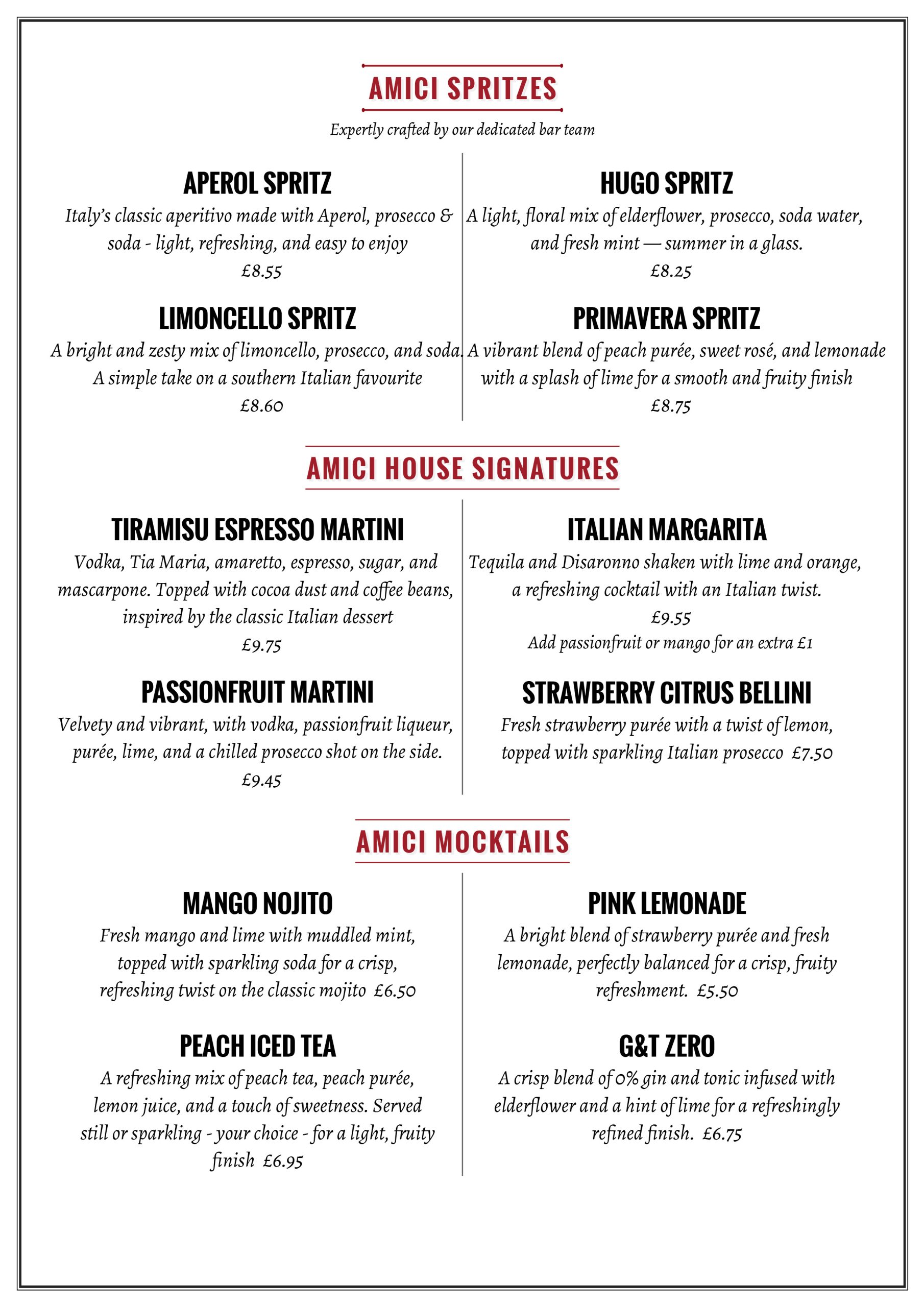 Tel: 01775 767696 Book Now Amici Italian Restaurant 2 Vine Street, Spalding, Lincs, PE11 1AN Home Book Now Valentine’s Day Our Menus Main Menu Dessert Menu Vegan and Vegetarian Menu Children’s Menu Takeaways Allergen Menu Cocktail menu Takeaways Work With Us Gift Vouchers Contact Cocktails Menu Add a touch of fun or decadence to your evening at Amici by trying one of our selection of cocktails. Book Now